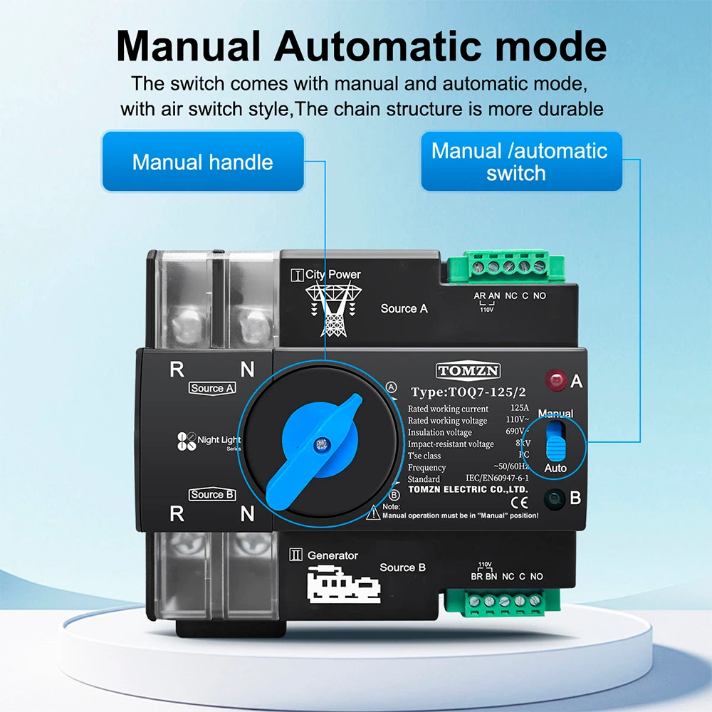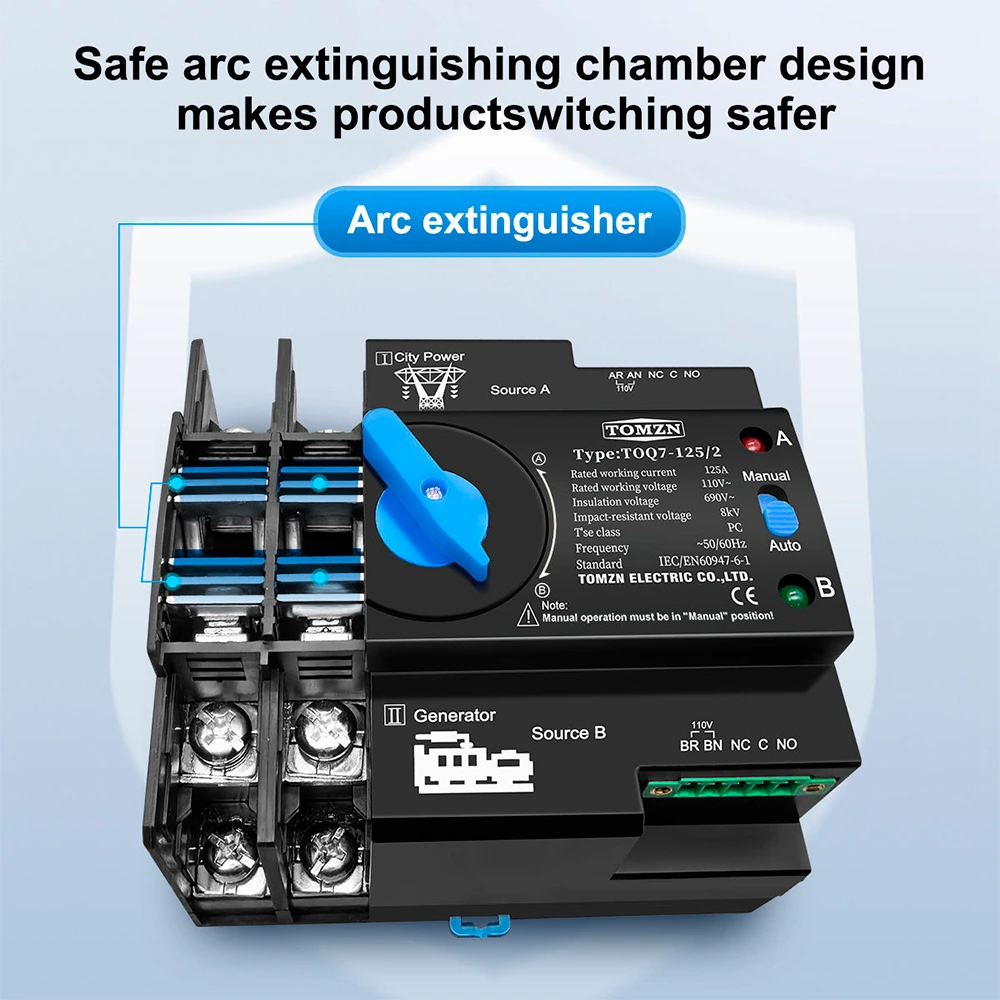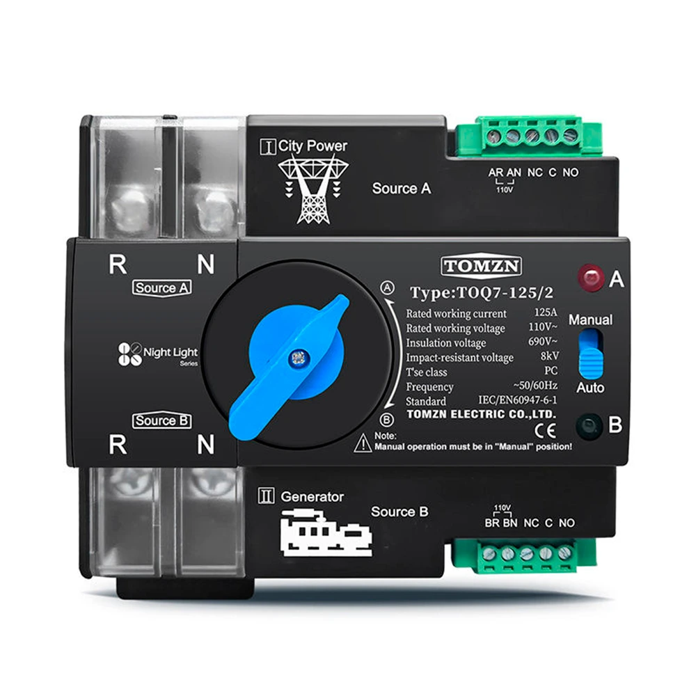 A chave de transferência automática TOMZN TOQ7-125/2 é a nova geração da linha TOQ, projetada para realizar a comutação entre rede principal e fonte de energia reserva (como geradores ou sistemas solares) de forma rápida e segura em sistemas de alta potência.