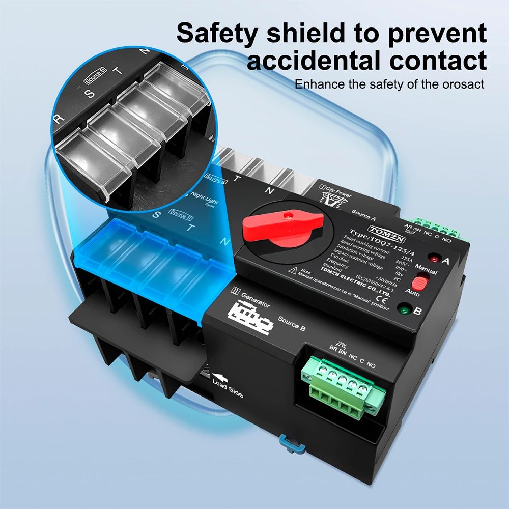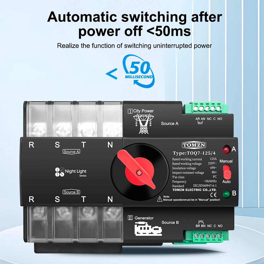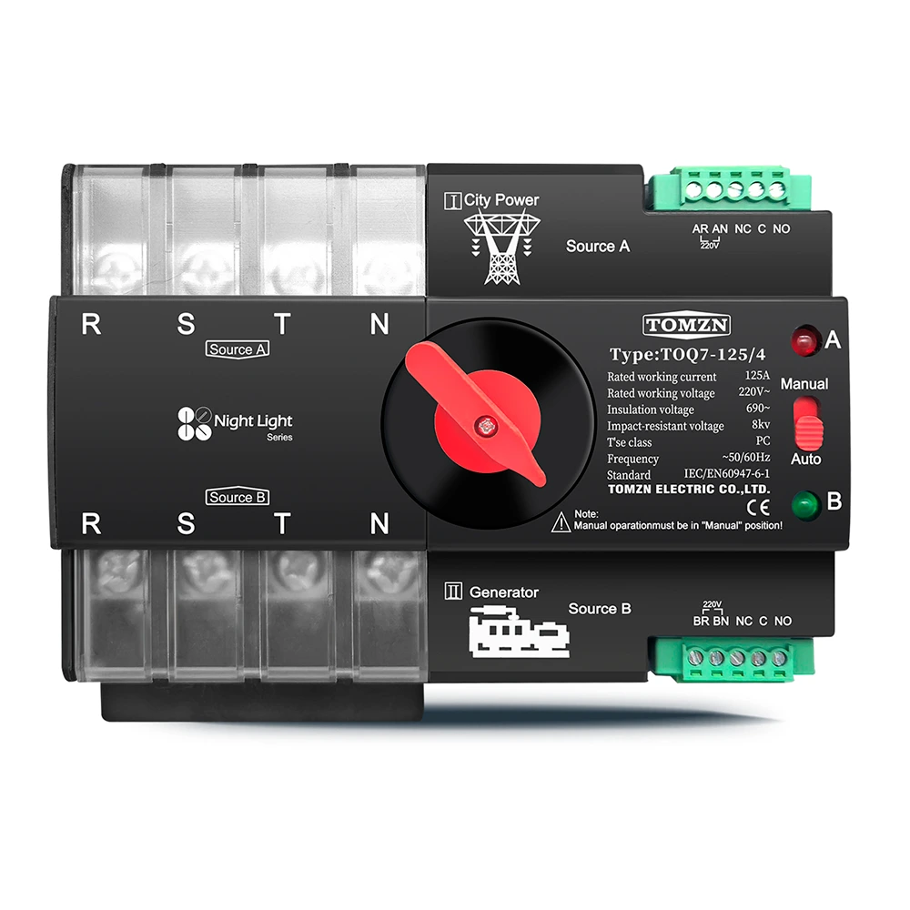 A chave de transferência automática **TOMZN TOQ7-125/4** é a **nova geração** da linha TOQ, projetada para realizar a comutação entre rede principal e fonte de energia reserva de forma **rápida e segura**.