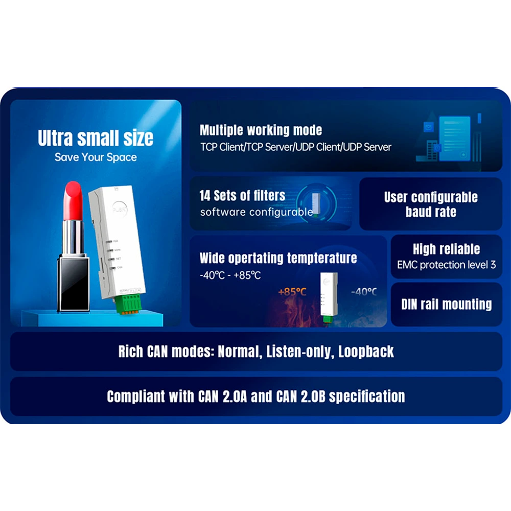 Este é um conversor industrial ultracompacto (“Lipstick”) de CAN-Bus para Ethernet (10/100Mbps), ideal para IIoT. Suporta padrões CAN 2.0A/B com taxas de 5 Kbps a 1 Mbps e inclui filtros inteligentes de dados (até 14 conjuntos). É robusto ($\text{-}40^\circ\text{C}$ a $+85^\circ\text{C}$), possui Dual Watchdog e aceita alimentação ampla (5V a 24V DC).
