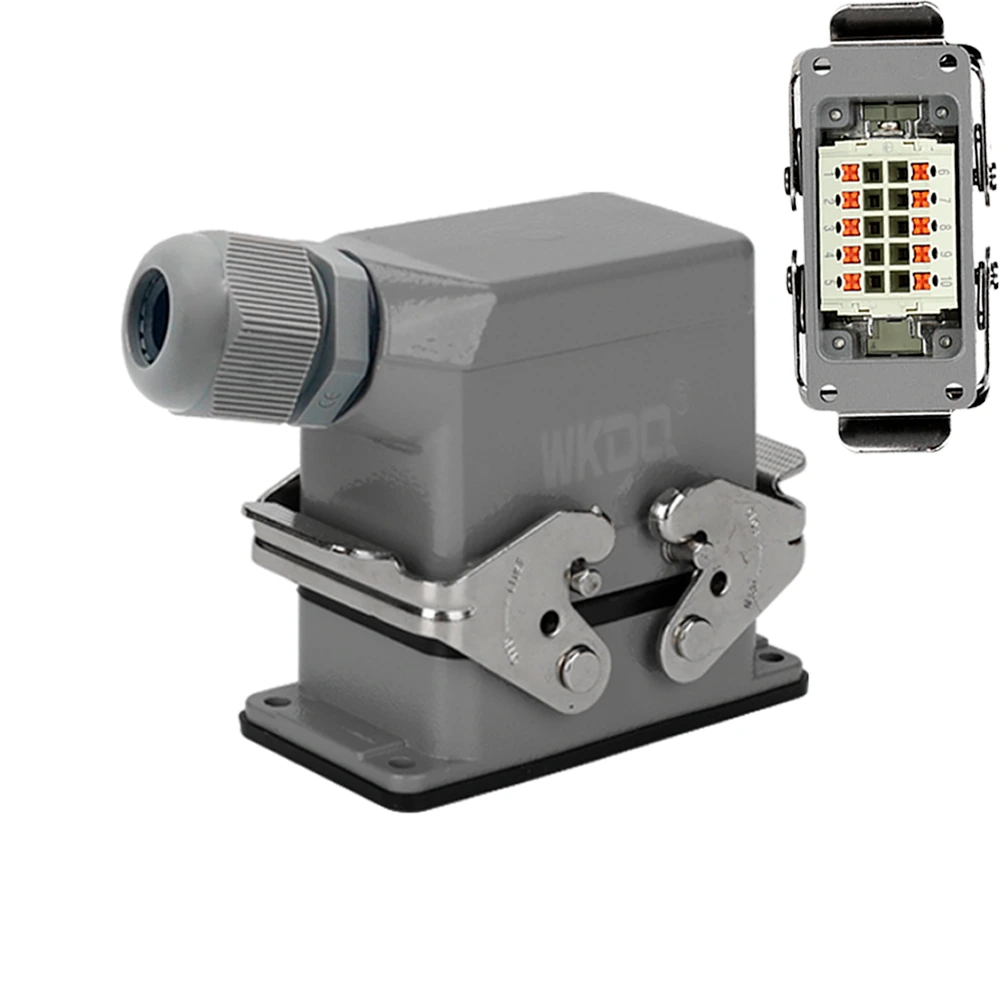A Tomada Industrial Multipolar WHE10CP é um conjunto completo (Plug Macho e Receptáculo Fêmea) de alta densidade, projetado para conexões robustas que exigem um maior número de contatos em ambientes industriais. Com a moderna tecnologia Push-in (sem parafuso), ela garante instalações rápidas, seguras e com excelente contato elétrico. O design com saída a 90 graus (lateral) otimiza o uso em painéis com limitação de espaço.