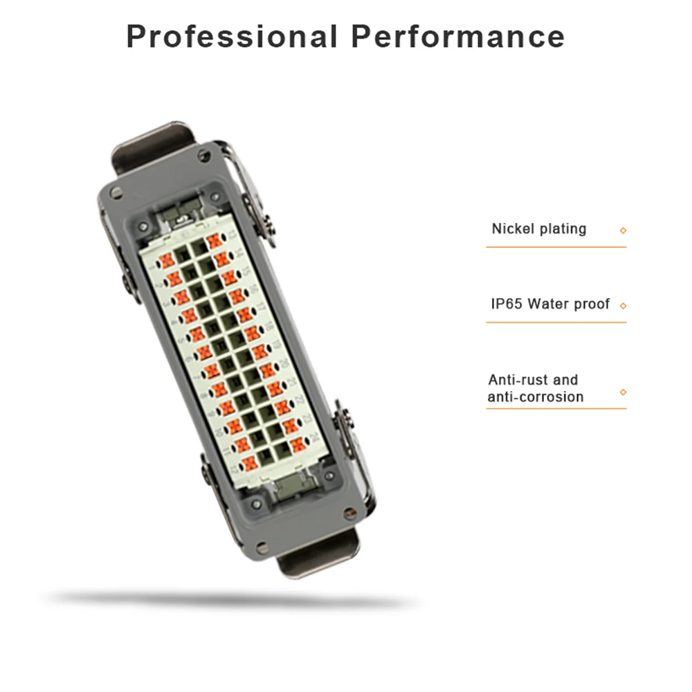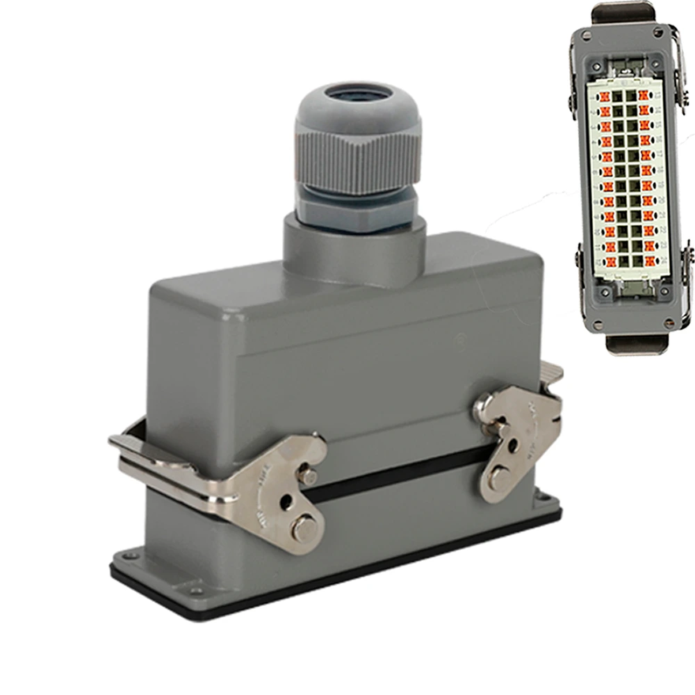 Este é um conjunto de tomada multipolar (Macho + Fêmea) com **32 Pinos + Terra (33 contatos)**, corrente de 16A e tensão de 230V. Apresenta sistema de conexão **Push-in** (sem parafuso) e **saída lateral (90 graus)**. Possui material isolante PA com classificação V0, é extremamente robusta (-40°C a +125°C) e ideal para sistemas industriais de alta complexidade que exigem o máximo de densidade de contatos.