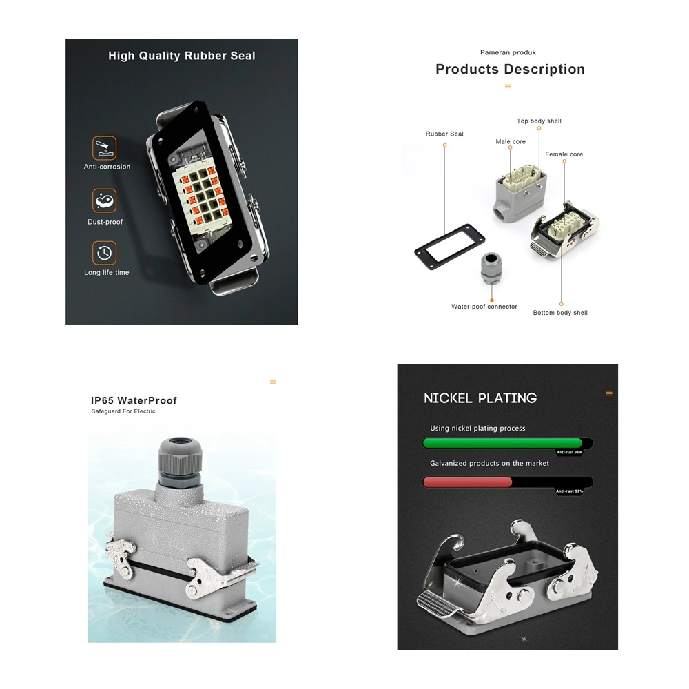 A Tomada Industrial Multipolar WHE24DP é um conjunto completo (Plug Macho e Receptáculo Fêmea) de **densidade máxima**, projetado para conexões robustas que exigem o **máximo de sinais e energia** em ambientes industriais. Com a moderna tecnologia **Push-in (sem parafuso)** e **24 pinos mais terra**, ela garante instalações rápidas e seguras. O design com **saída superior (reta)** é ideal para instalações onde o cabo precisa sair perpendicularmente ao painel.