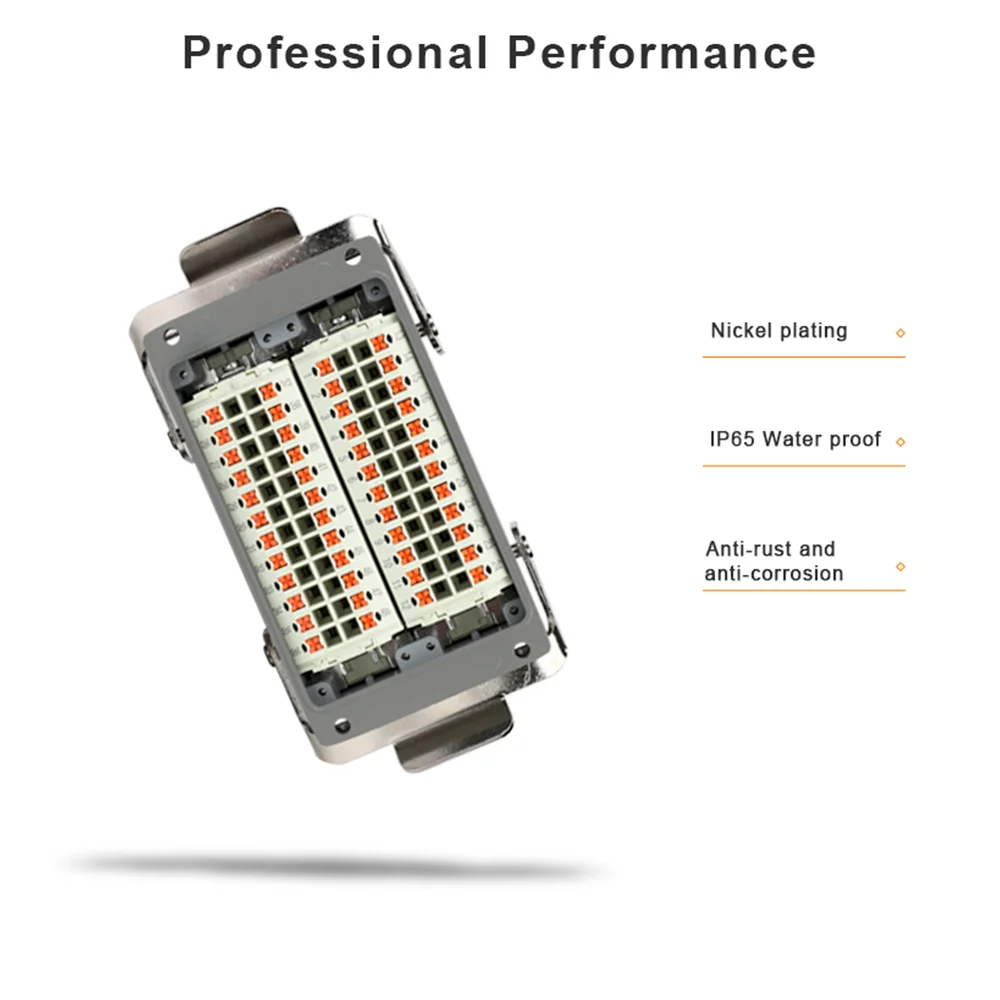 Este é um conjunto de tomada multipolar (Macho + Fêmea) com **48 Pinos + Terra (49 contatos)**, corrente de 16A e tensão de 230V. Apresenta sistema de conexão **Push-in** (sem parafuso) e **saída superior (reta)**. Possui material isolante PA com classificação V0, é extremamente robusta (-40°C a +125°C) e ideal para painéis de controle que exigem a máxima densidade de sinais e energia.