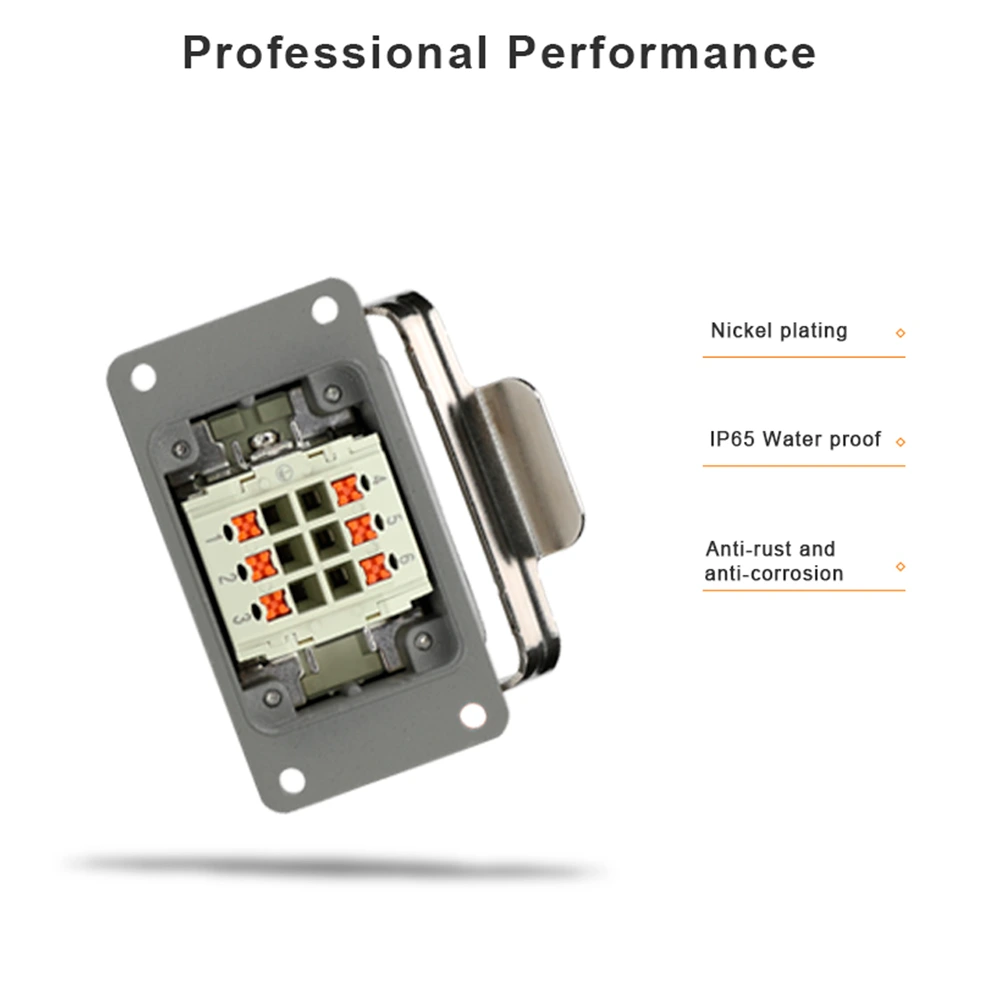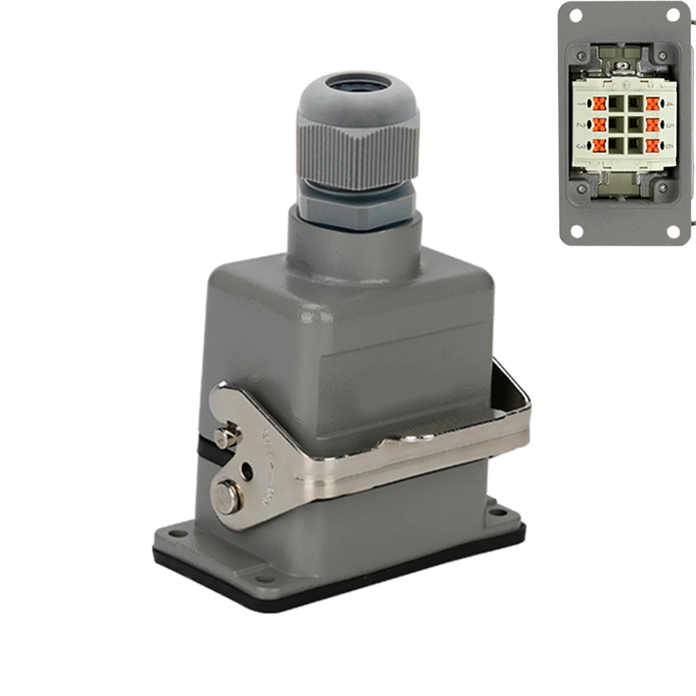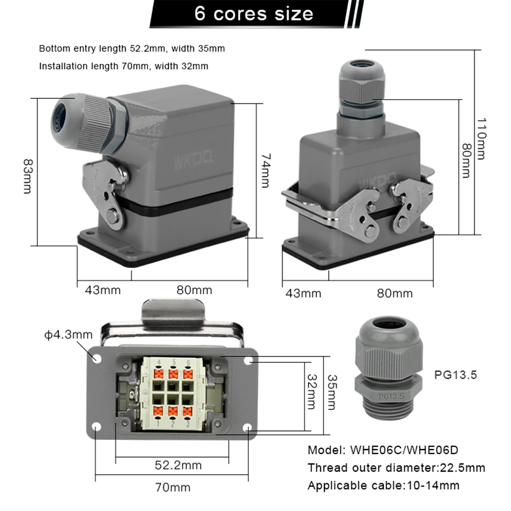 A **Tomada Industrial Multipolar WHE06DP** é um conjunto completo (Plug Macho e Receptáculo Fêmea) projetado para conexões robustas e de alta confiabilidade em ambientes industriais. Com a moderna tecnologia **Push-in (sem parafuso)**, ela garante instalações rápidas, seguras e com excelente contato elétrico. O design com **saída reta (superior)** é ideal para instalações onde o cabo precisa sair perpendicularmente ao painel.