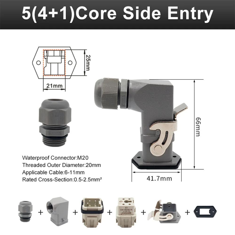 Este é um conjunto de tomada multipolar de **5 Polos (4+1)**, com capacidade de **10A / 250V**. O conjunto é completo (carcaça, base e soquetes macho/fêmea) com **saída lateral** e conexão por **parafuso**. Possui carcaça robusta em **alumínio**, travas em aço e **Grau de Proteção IP54**, sendo ideal para conexões seguras de potência e sinal em ambientes industriais.