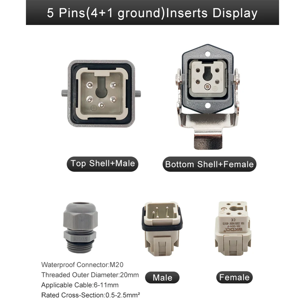 A **Tomada Industrial Multipolar WHA05C** é um conjunto completo projetado para conexões industriais de **potência e sinal**. É ideal para ser utilizado em máquinas, painéis elétricos e sistemas que exigem ligações **rápidas, seguras e resistentes**.